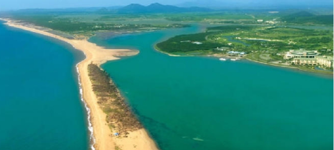 ? ?玉帶灘遠(yuǎn)觀南海煙波浩淼,一望無際,內(nèi)側(cè)萬泉河,沙美內(nèi)海的湖光山色。