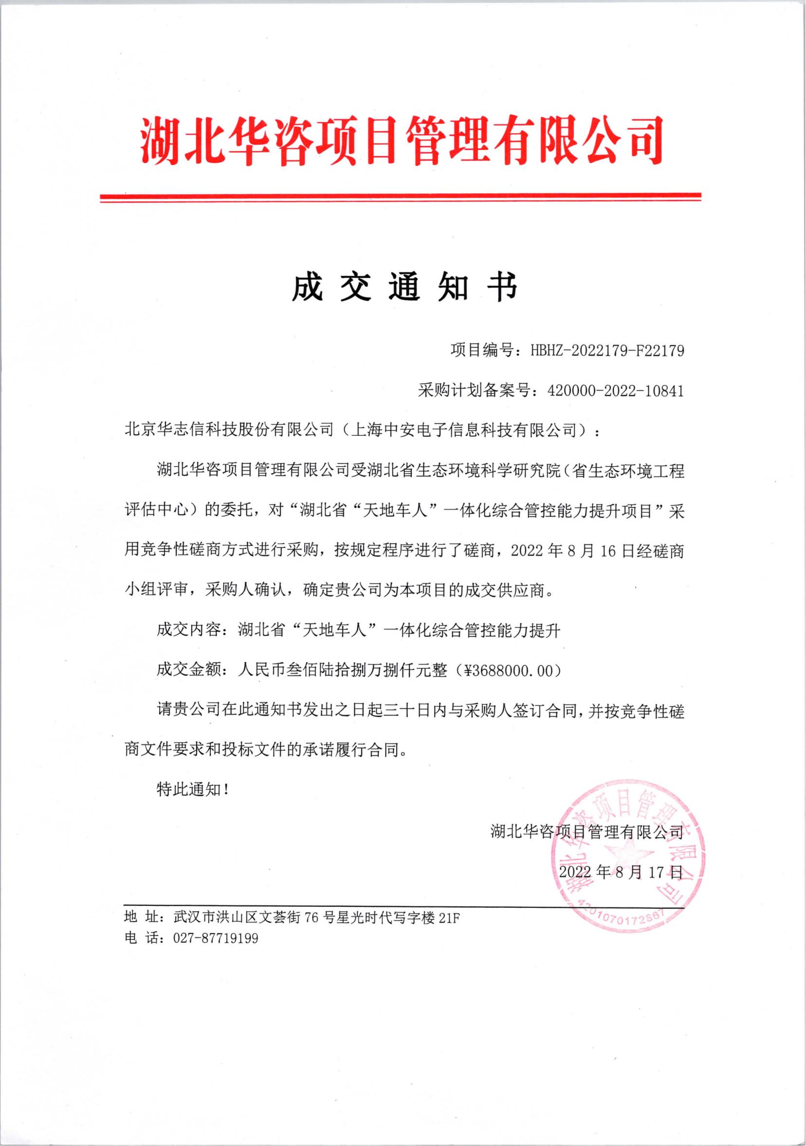 2022年8月17日,上海中安電子信息科技有限公司在”湖北省天地車人一體化綜合管控能力提升”