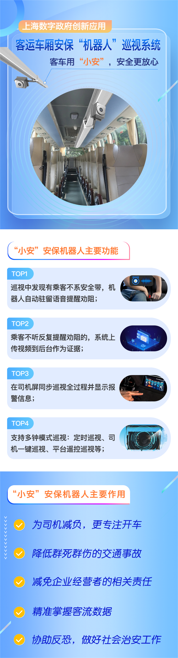 2.?減免企業經營者的責任:通過小安的巡視和提醒,企業經營者可以隨時隨地查看安全帶提醒視頻,便于管理并減少因乘客未佩戴安全帶而引發的安全隱患,從而減免了企業的相關責任。